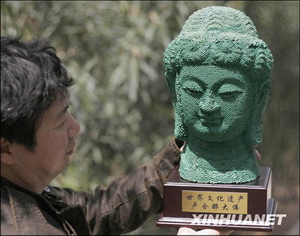 4月6日,洛阳群众艺术馆的李明甫展示他用火柴拼塑的一尊龙门石窟卢舍那大佛头像。