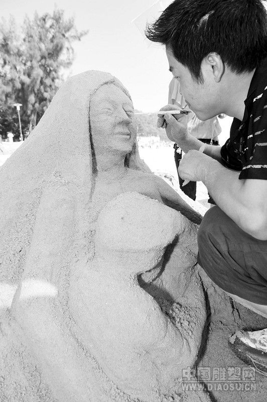 走近一看,原来是有人在现场制作雕刻,仔细观察,沙雕的初坯已经完成,一位慈祥的母亲正在哺育抚摸着怀抱中的孩子。沙雕的制作者陈先生来自厦门,为了不打扰他的工作,记者站在一旁观察。