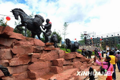 孩子们在观看铜雕(7月11日摄)。云南省临沧市永德县,是一个仅有2万多人口的边疆小县城,历史上茶马古道曾从此穿过。在永德县民族广场上,有一座占地面积500平方米的“茶马古道”铜雕,栩栩如生的马帮队及赶马人的群像造型,再现了昔日古道上那段尘封的历史。新华社记者 陈海宁摄