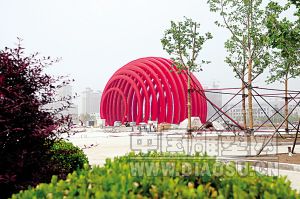 作为公园重要组成部分的主雕塑以“京津明珠”为主题,直径29米,高19米,设计遵循互动、融合、开放的理念,周边环境按照古城池的布局打造为四面静谧的水面,红色的半圆体雕塑与水中的虚空间影像融合为一个圆满的“京津明珠”,简明的视觉语言营造出概念玄妙的作品,同时寓意武清如一轮红日冉冉升起。