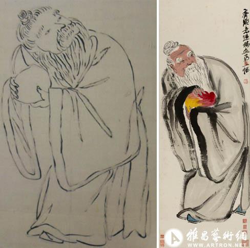 而认为嘉德拍卖的《松柏高立图》(以下称“嘉德本”)是以“乐曼雍本”为底本临摹作伪的,这种说法更加可笑。实际上在中国画中画家就同一题材、同一构图创作多幅相似作品的现象是很常见的。而在齐白石的作品中,这更是十分普遍的现象,因为齐白石是以卖画为生的职业画家,创作量比较大,有时对买家喜欢的题材也反复创作。在用心创出一幅自己认为出色的作品模板后,往往留下“粉本”,以备画此类画时就按此“粉本”来完成作品。齐白石就有以同种样稿,重复画出多张几乎一模一样的画,比如佛教题材《白衣大士图》就画了好几张重复的。其中有一张是画给四川军阀王瓉绪的;再比如《东方朔偷桃图》(见图片2)也画了多幅,每幅构图、用笔大同小异。北京画院就收藏了齐白石《钟馗搔痒图》墨笔草稿的“粉本”。齐白石就曾以此粉本创作过多幅《钟馗搔痒图》。所以,仅凭发现了另外一幅画面相近的作品,就判断其中一幅必定是假的,是缺乏对于中国书画基本常识的了解和表现。